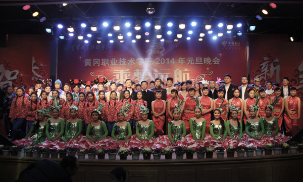 12月30日晚,大学生活动中心流光溢彩,洋溢着欢乐祥和的气氛,黄冈职院2014年“乘梦远航”元旦联欢晚会在此隆重举办。校党委书记张鹤桥,校长陈年友,党委副书记王维华,副校长段院生、万俊华,工会主席郑柏松,党委委员、校长助理胡燕,校长助理、医药卫生学院院长刘东山,各处室以及教学学院的部分领导欢聚一堂,共庆佳节。出席晚会的嘉宾还有赞助单位中国电信黄州分公司副总经理杜鹏,南湖营业厅主任游冰。