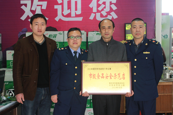 3月19日上午,黄冈市黄州区工商局经济开发区工商所所长罗卫东,带领副所长张建明和洪彬、科员王俊一行4人,专程驱车赶到智兴公司商贸部西苑超市,送来了“市级食品安全示范店”牌匾,并同商贸部领导及西苑超市店长进行了合影。据悉,食品安全创建工作是2013年黄冈市市政府的十件实事之一,为此黄冈市市政府专门成立了“黄冈市创建食品安全示范店领导小组”,Beat365西苑超市获此荣誉确实可喜可贺。