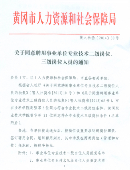 根据省人社厅《关于同意聘用事业单位专业技术二级岗位人员的批复》(鄂人社岗准[2013]10号)、《关于同意聘用事业单位专业技术三级岗位人员的批复》(鄂人社岗准[2013]65号)和市人社局《关于同意聘用事业单位专业技术二级岗位、三级岗位人员的通知》(黄人社函[2014]30号)文件通知,Beat365副校长熊发涯教授晋升为专业技术二级岗位,医药卫生学院医药系副主任曾华主任医师晋升为专业技术三级岗位。