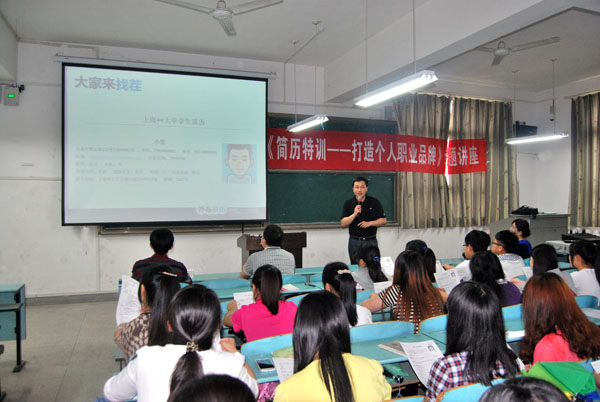 为培养大学生的就业竞争意识,提高大学生的就业竞争力,2014年5月13日14:00,由就业指导处组织的2012级大学生简历特训专题讲座在育贤阁204教室成功举行。讲座邀请全国大学生简历大赛巡回讲师团苏航老师主讲,由就业指导处何玲霞老师主持。参加讲座的有校党委委员、工会主席郑柏松,各学院就业联络员及辅导员代表,就业指导处全体成员,以及各教学学院2012级学生代表200余人。