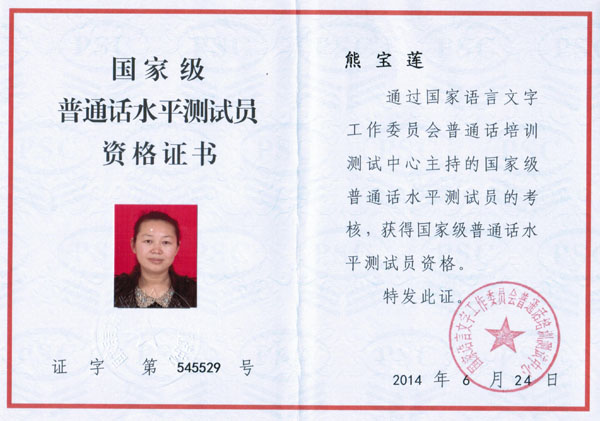 经过严格的培训和考核,熊宝莲老师通过了汉语拼音测验、普通话水平测试和普通话测试能力三项测试,最终顺利取得了国家级普通话水平测试员资格。成为Beat365第一位国家级普通话水平测试员。