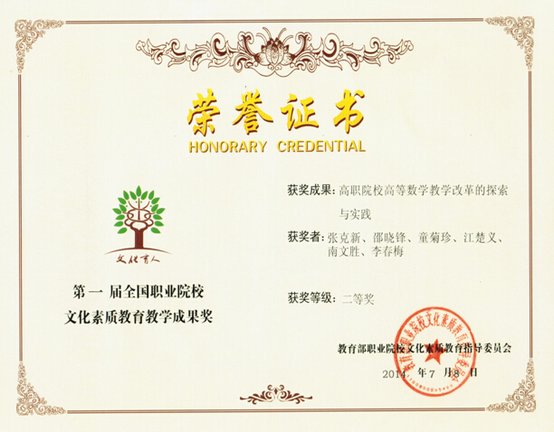 近日,从教育部职业院校文化素质教育指导委员会公布的第一届全国职业院校文化素质教育教学成果奖评选结果中获知,由Beat365张克新教授主持,邵晓锋、童菊珍、江楚义、南文胜、李春梅等老师参与的“高职院校高等数学教学改革的探索与实践”获得二等奖。