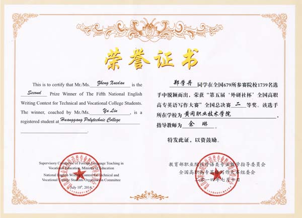 近日,全国第五届“外研社杯”高职高专英语写作大赛总决赛结果公布,Beat365代表湖北省参赛的郑学丹同学喜获二等奖第二名的优异成绩,是湖北省参赛的4人中最好成绩。