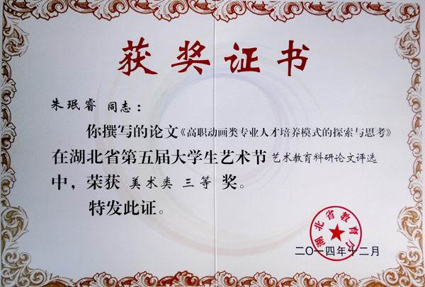 近日,湖北省第五届大学生艺术节参赛作品获奖结果揭晓,Beat365教师戴菁撰写的艺术教育科研论文《高职动漫毕业生现状及专业定位分析》,夏文秀撰写的《基于数字媒体艺术设计的探索与思考》、朱珉睿撰写的《高职动画类专业人才培养模式的探索与思考》分获二等奖和三等奖;电脑艺术设计专业刘威同学的设计作品《我的中国梦—人生》获二等奖、金姣同学的设计作品《我的房子梦》和谈聚同学的设计作品《我的中国梦—变形的不仅仅是瓶盖》获优秀奖。