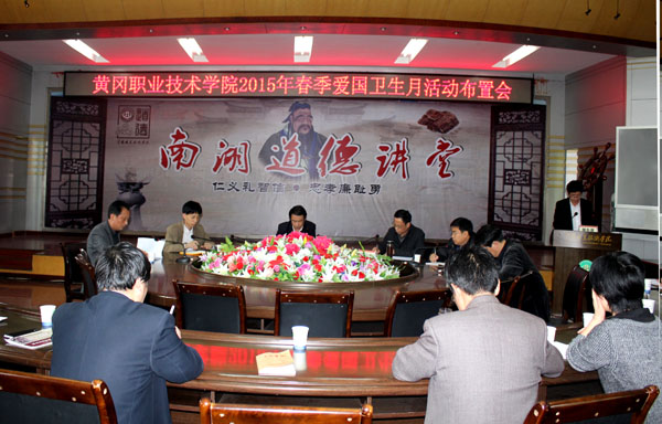 会上,后勤服务与保障处党总支书记黄正东带领与会人员学习了《国务院关于进一步加强新时期爱国卫生工作的意见》精神;学工处处长熊楚舒宣读了《黄冈职院2015年春季爱国卫生月活动方案》。