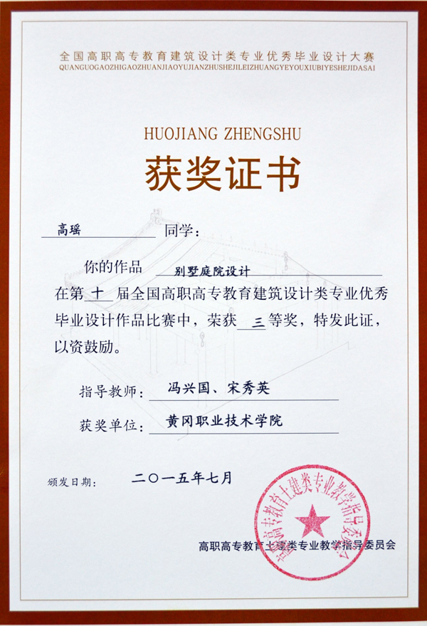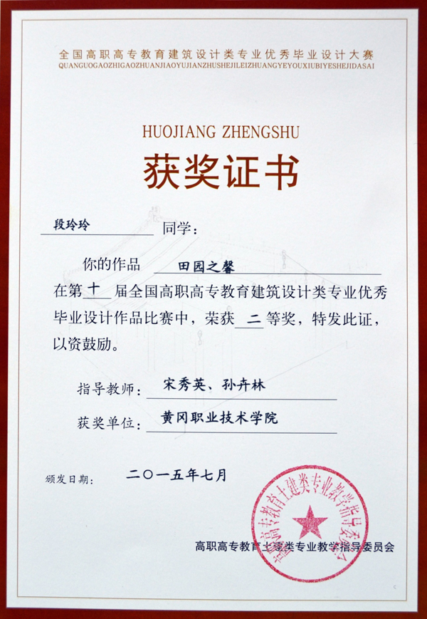 2015年7月24-26日,第十届全国高职高专教育建筑设计类毕业设计作品大赛在西宁(国家级)经济技术开发区隆重举行。Beat365建筑学院选送的优秀毕业设计作品获二等奖1项、三等奖2项。其中,建筑装饰工程技术专业201201班段玲玲同学的作品《田园之馨》荣获二等奖;装饰201101班李科敏同学的作品《水晶森林主题餐厅设计》荣获三等奖;装饰201101班高瑶同学的作品《别墅庭院设计》荣获三等奖。本次竞赛共有来自全国各高职院校230余份优秀毕业设计作品参加评选,Beat365在该项赛事中名列前茅。