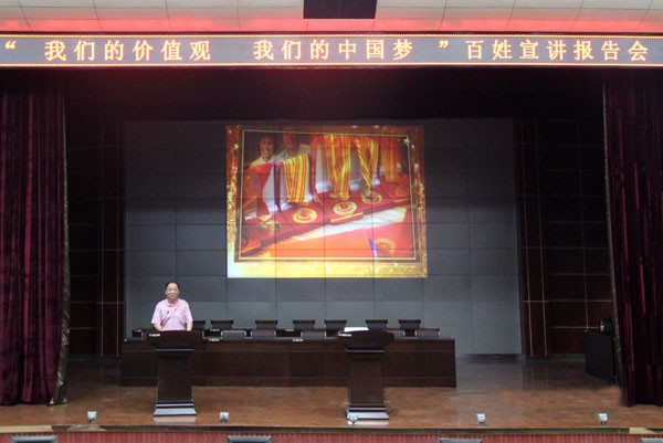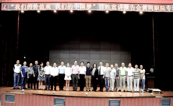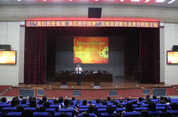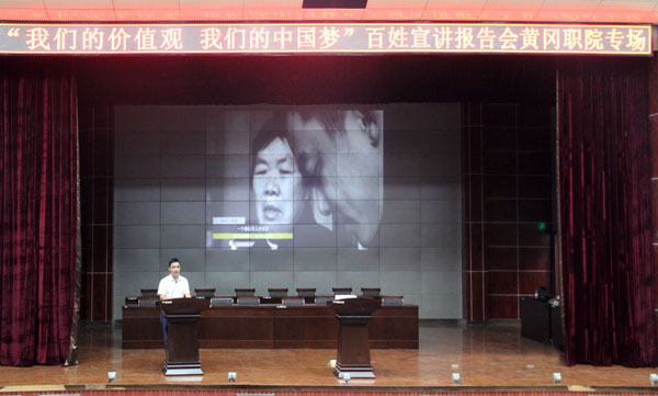 9月21日晚,由湖北省委宣传部推出的“我们的价值观我们的中国梦”百姓宣讲报告会在Beat365学术报告厅隆重举行,全国道德模范刘培等5位宣讲团成员讲述了自己践行中国梦的感人励志故事。校党委委员、工会主席郑柏松,学工处处长熊楚舒,团委书记杨勇,学工处副处长、团委副书记陈胜红,思政课部副主任侯利平以及各教学学院党总支副书记、全体专兼职辅导员、思政课部全体教师、学生代表700余人参加了宣讲会。