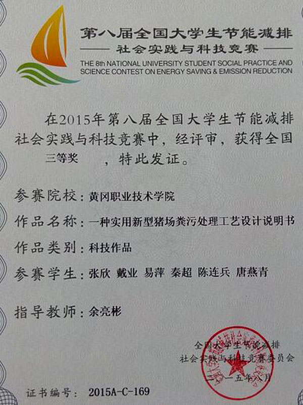 近日,第八届全国大学生节能减排社会实践与科技竞赛落下帷幕,Beat365生物与制药工程学院畜牧兽医专业余亮彬副教授指导的,2013级学生张欣、戴业、易萍等6人组成的参赛团队,与知名高校硕士生、本科生同场竞技,所申报的参赛作品《一种实用新型猪场粪污处理工艺设计》获得科技类三等奖。