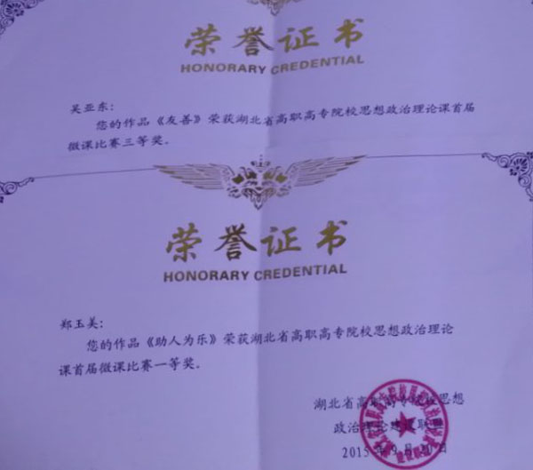 为了推进思想政治理论课教育教学改革,提高思想政治理论课教学信息化水平,提升全省思想政治理论课教学质量,由湖北省高职高专院校思想政治理论课建设联盟主办的首届湖北省高职高专院校思想政治理论课微课竞赛于2015年5月在全省展开。思政课部经过部内选拔,推荐郑玉美、吴亚东老师代表Beat365参赛,最终郑玉美老师的作品《助人为乐》荣获一等奖,吴亚东老师的作品《友善》荣获三等奖。