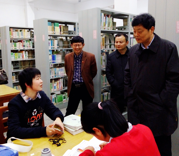 张书记首先来到文科馆一楼借还大厅,与图书馆职工进行亲切交谈,询问日常服务工作的开展情况和学生借阅动态以及工作中遇到的困难。随后,张书记在图书馆直属支部书记段茂盛、副馆长刘开国、办公室主任童菊珍等人员的陪同下,逐层观看了文科馆和理科馆各个书库、阅览室,并不时提问,与职工、与学生交谈。在边看边问边答中,段茂盛汇报了图书馆的发展思路、日常管理与服务创新、积极开展读书月活动情况以及目前存在的困难和需要学校支持的政策。张书记充分肯定了图书馆的工作,并对图书馆的建设发展提出了具体要求。