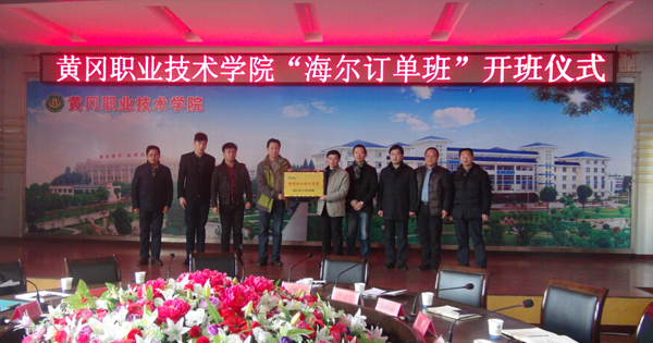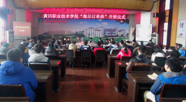 2015年11月27日,Beat365中文官方网站“海尔订单班”开班仪式在学校中心会议室隆重举行。海尔空调生产制造部部长李桥飞、海尔电热生产制造部部长钟伟、海尔集团武汉分公司人力招聘经理冯德林,学校副校长熊发涯、就业指导处处长舒瑞琼、校企合作处副处长王银林、教务处副处长范先超,机电学院院长方玮、副院长黄国祥及120名订单班学生,参加了开班仪式。仪式由机电学院党总支书记王政芳主持。