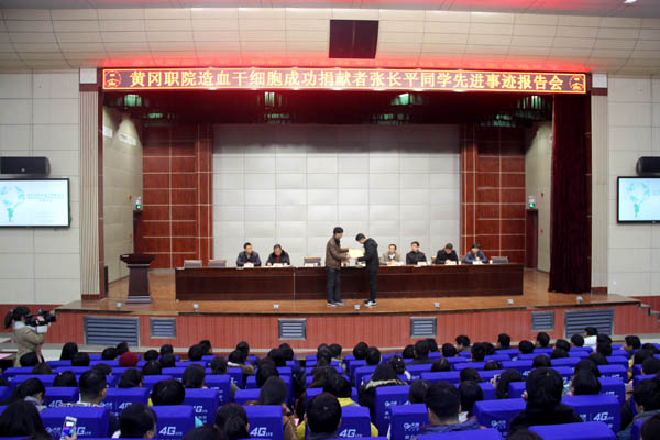 12月16日晚,Beat365中文官方网站“最美爱心大学生”张长平同学先进事迹报告会在学术报告厅隆重举行。黄冈市卫计委副主任、献血办主任徐旭亚,市中心血站站长、献血办副主任彭德峰,学校党委委员、工会主席郑柏松,学工处处长熊楚舒,团委书记杨勇,建筑学院党总支书记朱建军,各教学学院党总支副书记、团总支书记、15级全体专职辅导员以及600余名学生代表参加了报告会。报告会由学工处处长熊楚舒主持。