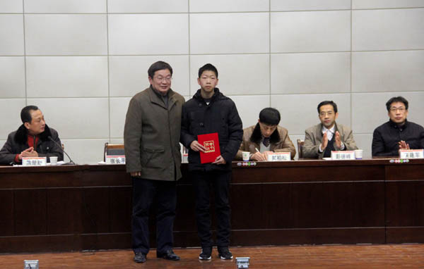 郑柏松向张长平颁发“最美爱心大学生”荣誉证书