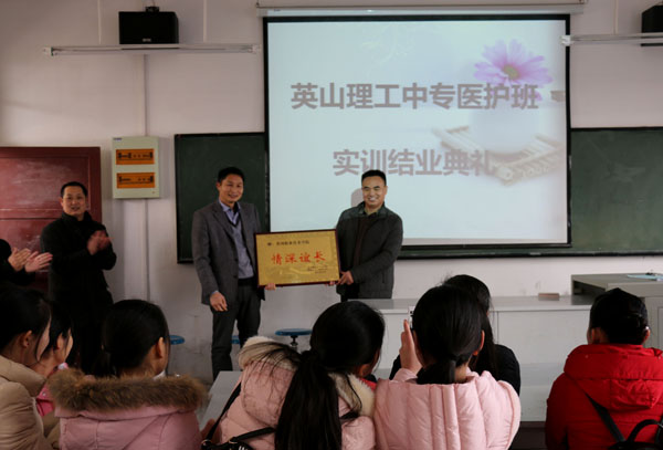 2015年12月18日,英山理工中专医护班技能实训结业典礼在崇贤阁401教室隆重举行。英山理工中专党委委员肖亚,高三年级主任肖爱武;Beat365副校长刘东山、招生处处长田安国、电子信息学院党总支书记冯军、医药卫生学院医护专业负责人宋保兰及英山理工中专医护班69名学生参加了此次结业典礼。典礼由田安国主持。