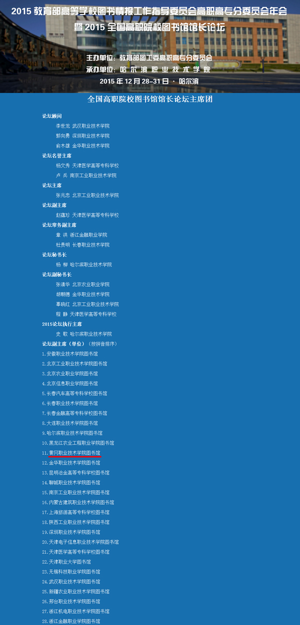 12月28-31日,2015年教育部高等学校图书情报工作指导委员会高职高专分委员会年会暨2015年全国高职院校图书馆馆长论坛在哈尔滨职业技术学院隆重召开。