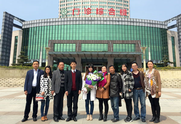工会主席郑柏松(左四)、罗田县人民医院党委委员罗永秀(右五)等与余康颖合影