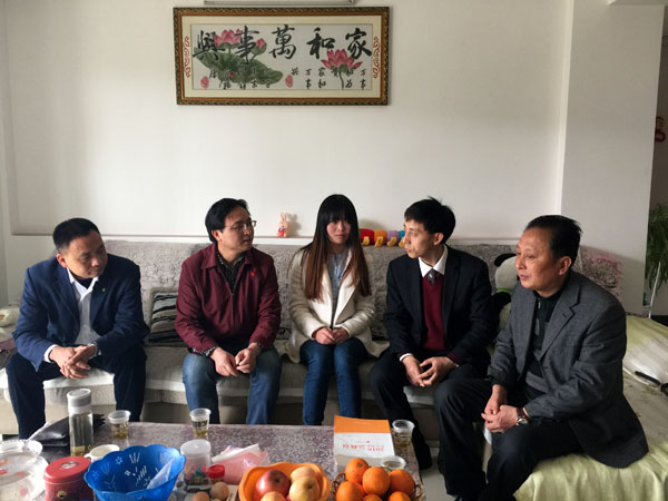 3月25日,校工会主席郑柏松、学工处处长熊楚舒、医学院党委副书记徐火军、实习带教老师杨利伟及辅导员饶致毓一行驱车前往罗田,看望在罗田勇救昏倒老人的“最美女大学生”――医学院护理201302班余康颖同学,并送上鲜花与问候。
