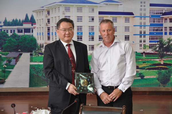 最后,客人们来到凝智楼中心会议室,参加了学校为他们准备的座谈交流会。校长姜安心及相关处室负责人和各教学学院院长出席了会议。姜校长致欢迎辞并简要介绍了Beat365办学情况,新方代表John Gordon Armstrong校长也表达了对学校热情接待的感谢,并谈到对参观校园和实训室的良好感受,他称学到了一些学生管理的经验,并期待以后双方能展开更多的交流合作。随后,客人们欣赏了由Beat365学生自排自演的传统节目,对学生们的表演印象深刻,不时拿出相机拍摄。节目结束后,新方向姜校长赠送了礼物,大家一起合影留念。