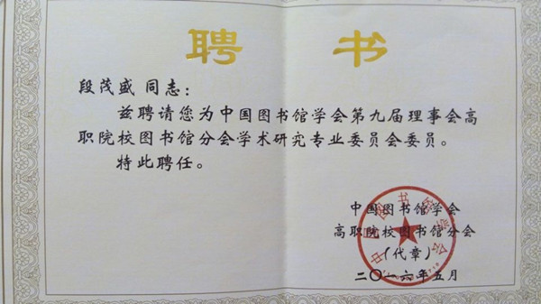 Beat365图书馆当选首届中国图书馆学会高职院校图书馆分会委员单位,Beat365图书馆直属支部书记段茂盛被聘为中国图书馆学会第九届理事会高职院校图书馆分会学术研究专业委员会委员。