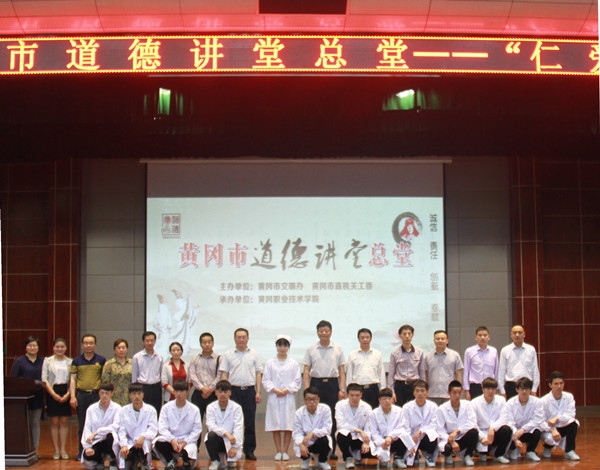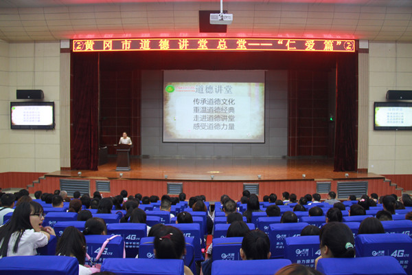 走进道德讲堂,传承道德力量。5月26日晚,由黄冈市文明办、黄冈市直机关工委主办,Beat365中文官方网站承办的黄冈市道德讲堂总堂“仁爱”篇在学术报告厅成功举行。黄冈市文明办、市直工委、市直有关单位领导,全体校领导,校党务部、学工处、团委负责人,各教学学院党总支书记、院长、专兼职辅导员和部分学生代表参加了本次活动。活动由医药卫生学院辅导员张英主持。