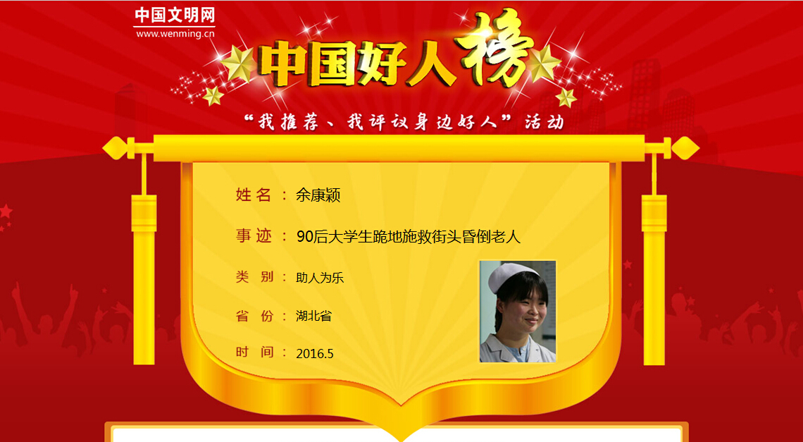 5月31日,中央文明办在陕西榆林举办全国道德模范与身边好人现场交流活动,并发布“中国好人榜”5月榜单,109位爱心人士上榜,其中湖北上榜3位,我市跪地施救街头昏倒老人的“最美女孩”余康颖光荣上榜。