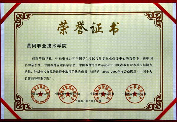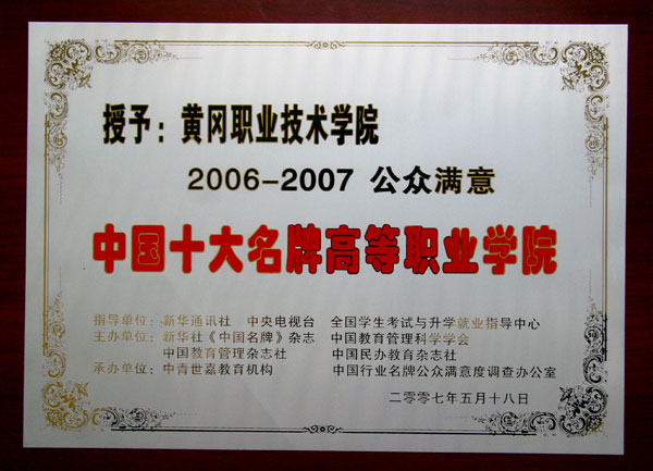 5月18日,院长陈年友在全国政协礼堂出席了“2006-2007年度中国教育名牌总评榜”颁奖典礼,我院被评为“2006-2007年度公众满意·中国十大名牌高等职业学院”,陈院长代表获奖高等职业院校学校系列(共有13个系列)在大会上作了典型发言。