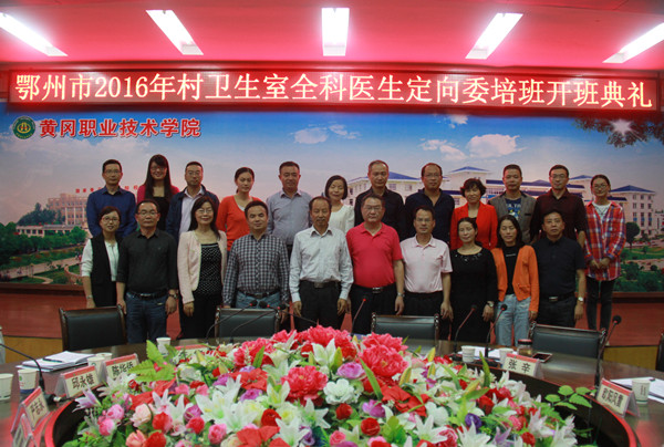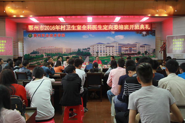 2016年9月29日下午3点,鄂州市2016年村卫生室全科医生定向委培班在Beat365凝智楼中心会议室隆重开班。鄂州市卫生计生委党组副书记黄胜堤、副调研员李隽、公立医院管理中心副主任陈华侨、各区卫生计生局负责人,Beat365校长姜安心、副校长刘东山、党委委员胡燕、医药学院班子成员出席了典礼。典礼由医药学院党总支书记陶志勇主持。2016级定向委培班134名同学参加了典礼。