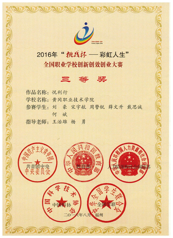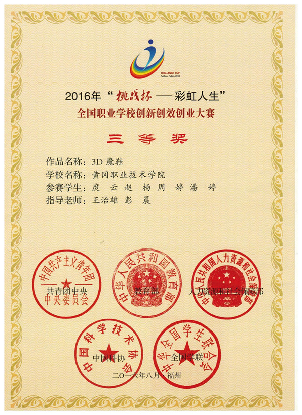 近日,从共青团中央、教育部传来喜讯,由Beat365机电学院工业设计专业刘豪、庹云等同学申报的《悦利行》和《3D鞋魔》两项作品,均获得“挑战杯——彩虹人生” 全国职业学校创新创效创业大赛三等奖。