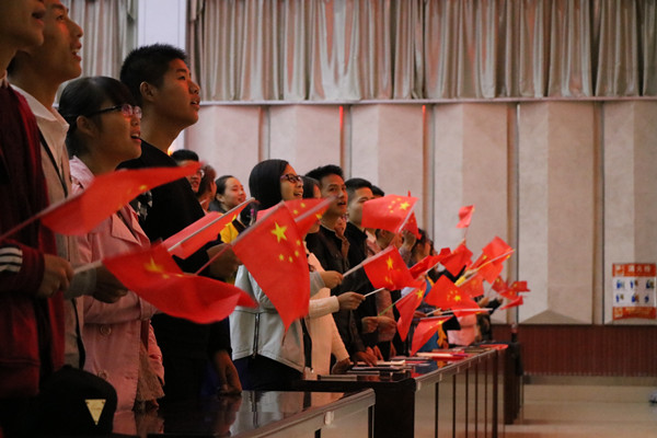 歌手大赛总决赛共分为三轮。16名选手依次演唱各自的精彩曲目。在比赛中,不论是余音缭绕的《隐形的翅膀》,还是深情演绎的《十送红军》;不论是雄浑壮美的《红旗飘飘》,还是婉转萦绕的《映山红》;不论是清快明朗的《小背篓》,还是震撼心扉的《我和我的祖国》,都无不深深感染了全场观众。在场观众纷纷摇动着手中的国旗伴着音乐节拍轻轻鼓掌、小声唱和,有的同学还自发的拿起了手机照明灯为选手加油、鼓劲。现场气氛温馨而又催人奋进。参赛选手用优美的歌声和扎实的舞台功底赢得了台下评委老师和观众们的阵阵掌声。
