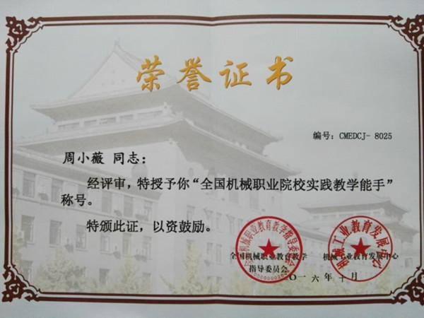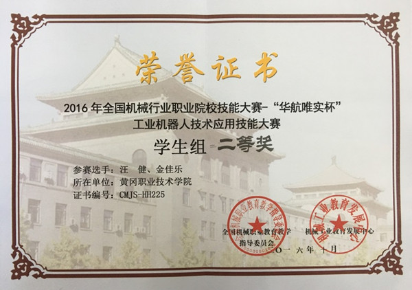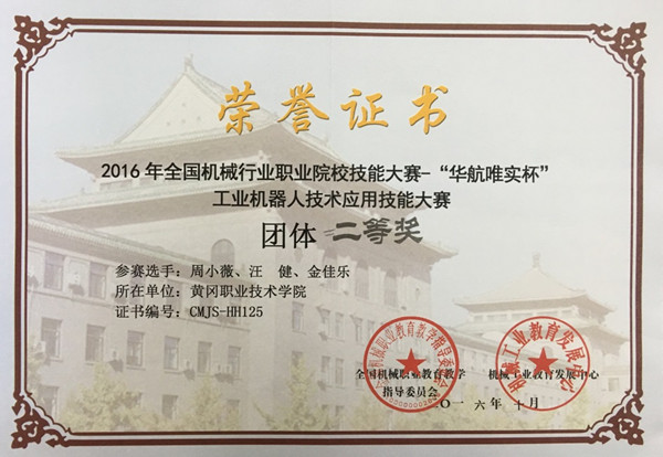 2016年10月25日—26日,2016年全国机械行业职业院校工业机器人技术应用技能大赛在山东省潍坊市举行。Beat365选派机电学院教师周小薇,学生汪健、金佳乐参加了本次大赛。经过两天的艰苦、全封闭比赛,Beat365喜获团体二等奖及学生组二等奖,工业机器人技术专业教师周小薇荣获“全国机械职业院校实践教学能手”荣誉称号。