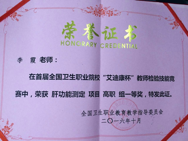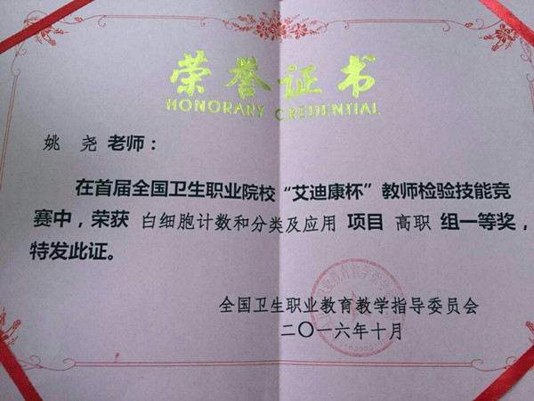 本次竞赛分为高职组、中职组两个级别,共有全国56所高职、18所中职学校报名参加,参赛教师100余人。Beat365医学检验技术专业教学团队的姚尧和李霞两位老师分别参加了高职组肝功能测定及应用、白细胞计数和分类计数及应用竞赛项目,丁海峰副教授应邀担任了本次竞赛的评委。
