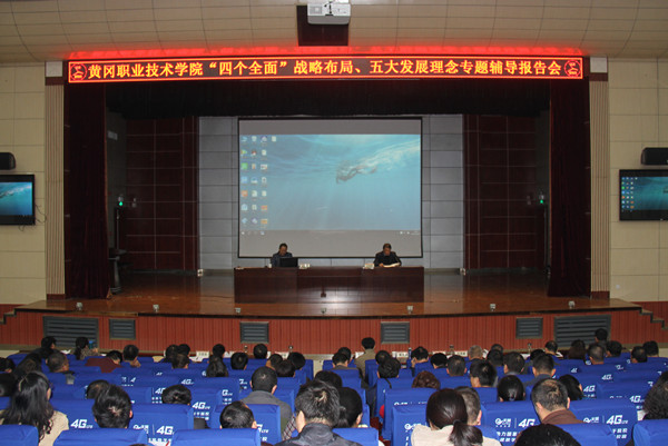张宏书的专题辅导报告由三部分构成:深刻把握“四个全面”战略布局的思想内涵、深刻认识五大发展理念重要性和以五大发展理念协调推进“四个全面”战略布局。专题辅导报告课件设计精美,图文并茂;视频动画生动形象,通俗易懂;语言幽默风趣,充满激情。“四个全面”战略布局、五大发展理念在广大师生员工心目中已悄然生根发芽。