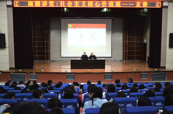 程朗从“社会主义核心价值观的前世今生” “说文解字话友善” “传统文化中的友善” “构建和谐社会需要友善” “当代大学生如何做到友善”五个方面,对“友善”进行了深入浅出的解读。他在讲解的过程中,理论与实践并重,穿插了丰富的案例,回答了“老人倒地扶不扶、乞丐伸手给不给、爱心捐款捐不捐”等日常生活中遇到的棘手问题,学生受益匪浅。