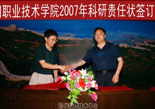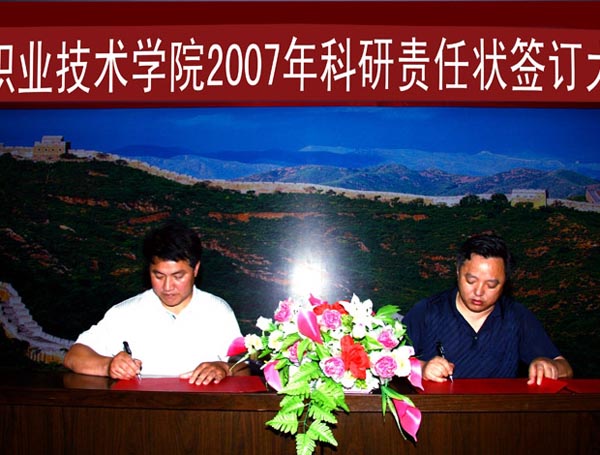 推行科学合理的精细化管理理念,实现行之有效的科研激励机制,是学院领导对科研管理工作的一贯要求。为促进我院示范性院校建设,充分调动全院教职工科研工作的积极性和创造性,建立与完善科学合理的科研考核指标体系,按照院党委、院行政年初提出的“围绕办学理念,开展科技创新工程”的工作目标,科研处结合学院有关科研管理制度和全院科研人员结构状况,明确目标,落实责任,本着“自我加压、量入而出”的原则,制订了2007年度全院科研目标任务,并组织本次责任签字活动,在内容和形式上实现了我院科研规范管理的第一步。