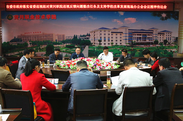 2017年4月21日,学校在中心会议室组织召开“市委市政府落实省委巡视组对黄冈职院巡视反馈问题整改任务及支持学校改革发展现场办公会会议精神”传达会。全体例会人员及其他副县级干部、教学单位副职干部、办公室主任、教师代表参加了此次会议。会议由校长姜安心主持。