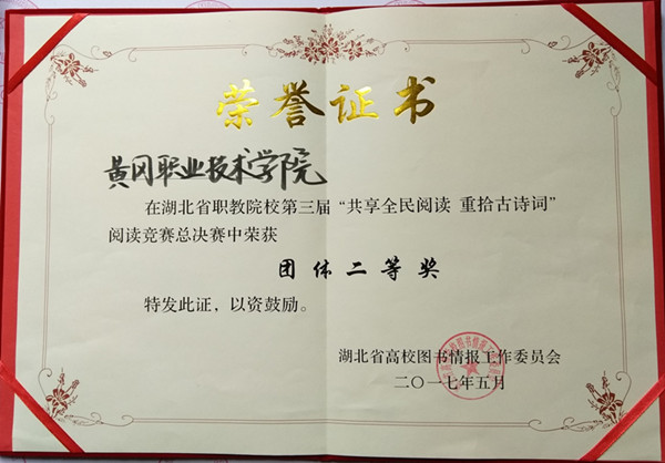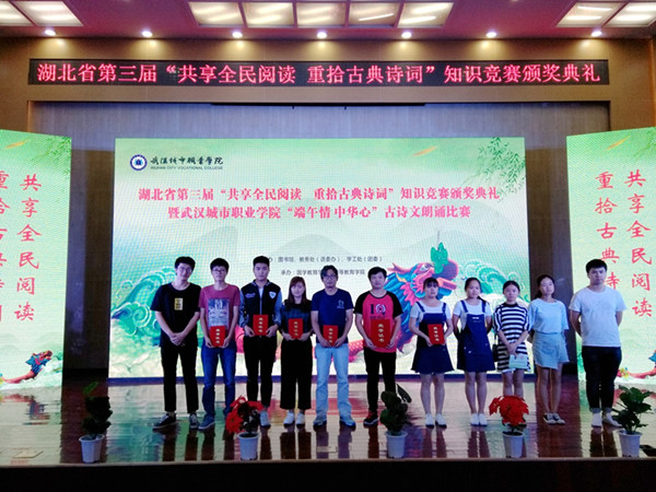 2017年5月27日下午,湖北省高职院校“共享全民阅读 重拾古典诗词”阅读竞赛总决赛,在武汉城市职业学院图书馆隆重举行,来自全省32所高职院校的100名学生参加了现场决赛,Beat365代表队荣获团体二等奖,护理学院中护理201501班王盼、医药学院临床201601班郭小玲分获个人二等奖,电子信息学院互联网201604班顾宇晨、生物与制药工程学院园林201601班周鹏分获个人三等奖,徐学斌获“优秀指导老师”。